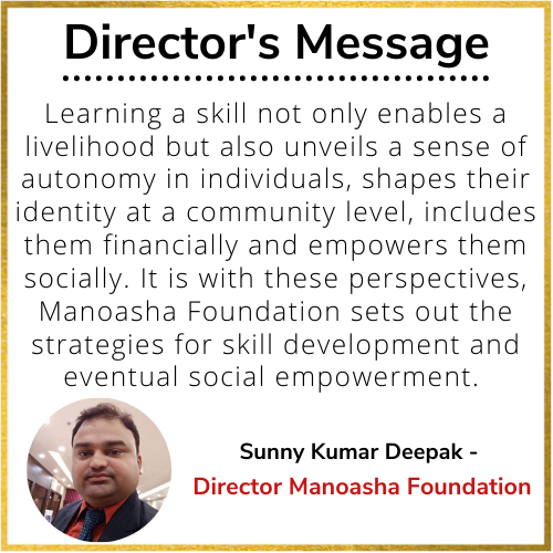 Manoasha Foundation is a not-for-profit organization It’s registered as Limited by share for pre-defined objects or activity Education, Health and Social Work. It’s registered as Limited by share for pre-defined objects or activity Education, Health and Social Work and Inclusive Growth, aimed at enabling and providing livelihood opportunities to underprivileged youth.There is an entire suite of development programs which are aimed at bringing about holistic transformation in the underprivileged community. The organization works closely with people who live in the lowest echelons of the social system for their socio-economic progress.